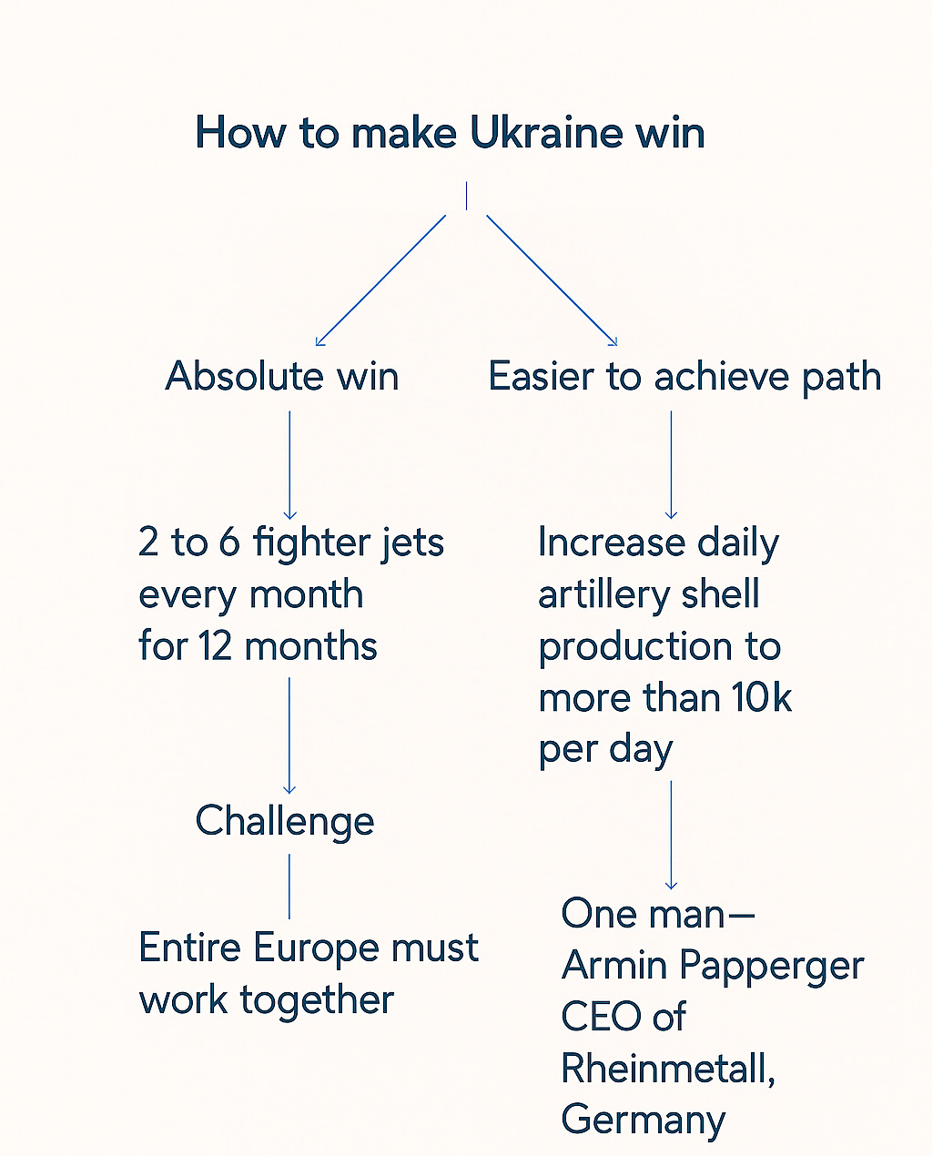 The hard path: an absolute win. It requires supplying Ukraine with 2 to 6 fighter jets every single month — for at least a year. That’s 24 to 72 jets. Fully armed, fully operational. To make that happen, Europe must act in unison — not as 25 fragmented states but as one coherent bloc with a wartime production mindset. That’s the challenge.
